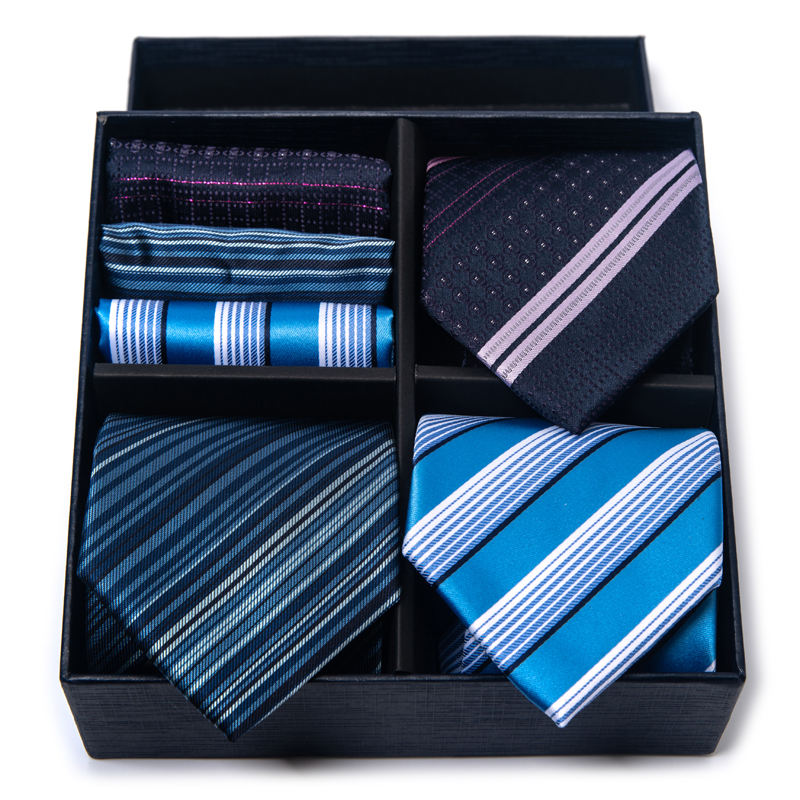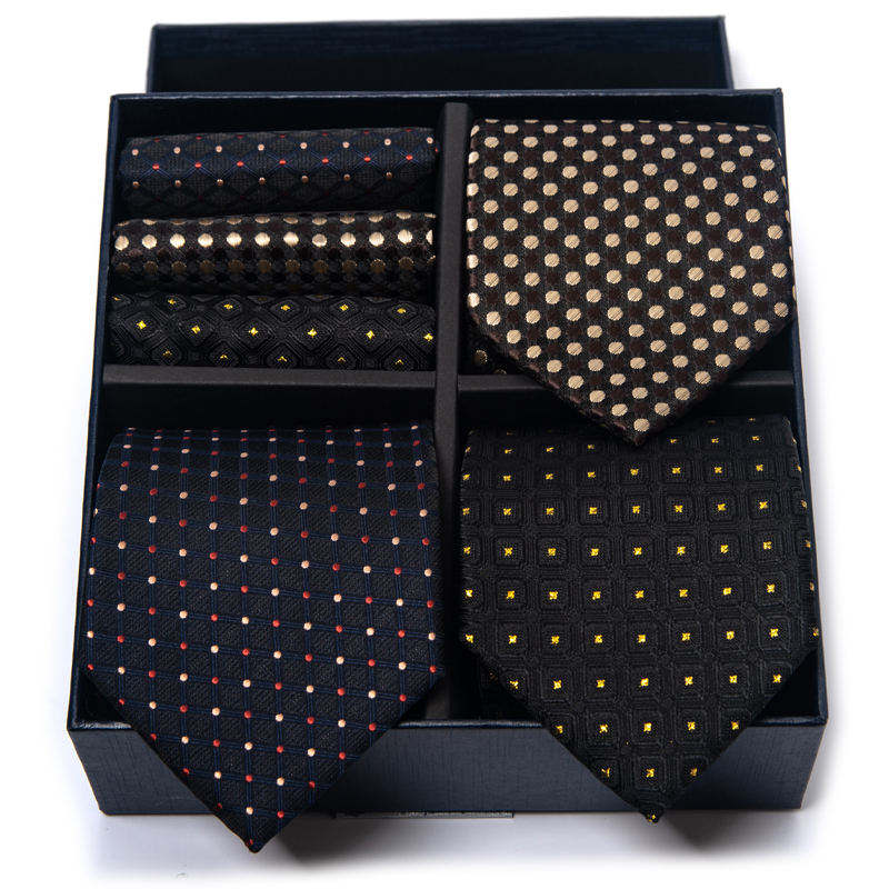 Coffret Cadeau de Luxe 3 Pièces : Cravate, Mouchoir et Boutons de Manchette pour Homme, Accessoires de Costume Points Dorés sur Fond Noir