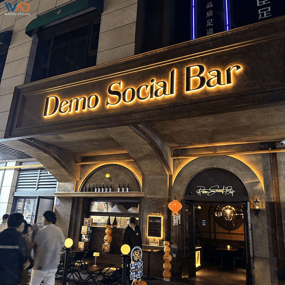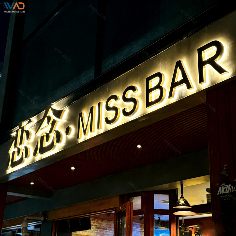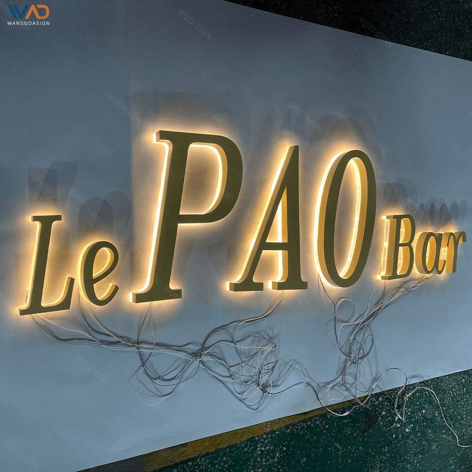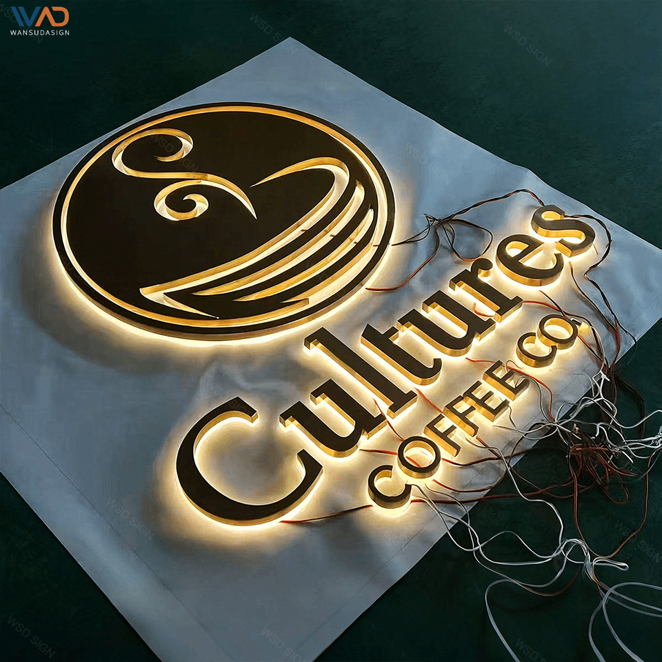 Enseignes murales métalliques lumineuses de luxe, personnalisées en acier inoxydable brossé, effet halo, affichage LED de logo pour la décoration de salons, hôtels et bureaux