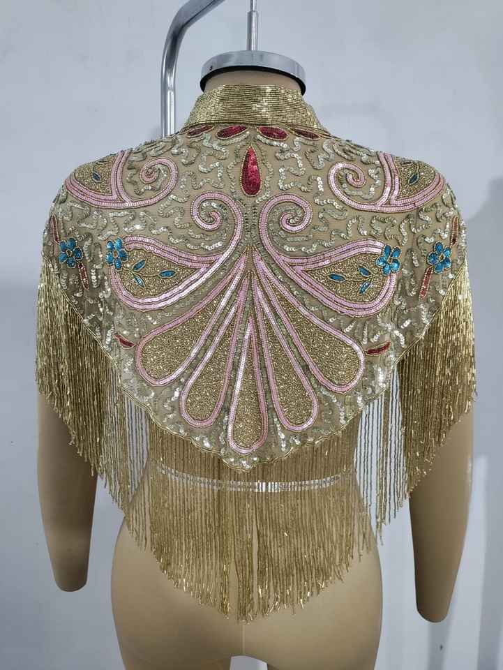 Blouse de luxe dorée brodée à la main avec franges perlées, col à sequins et pompons, idéale pour les mariages et les spectacles