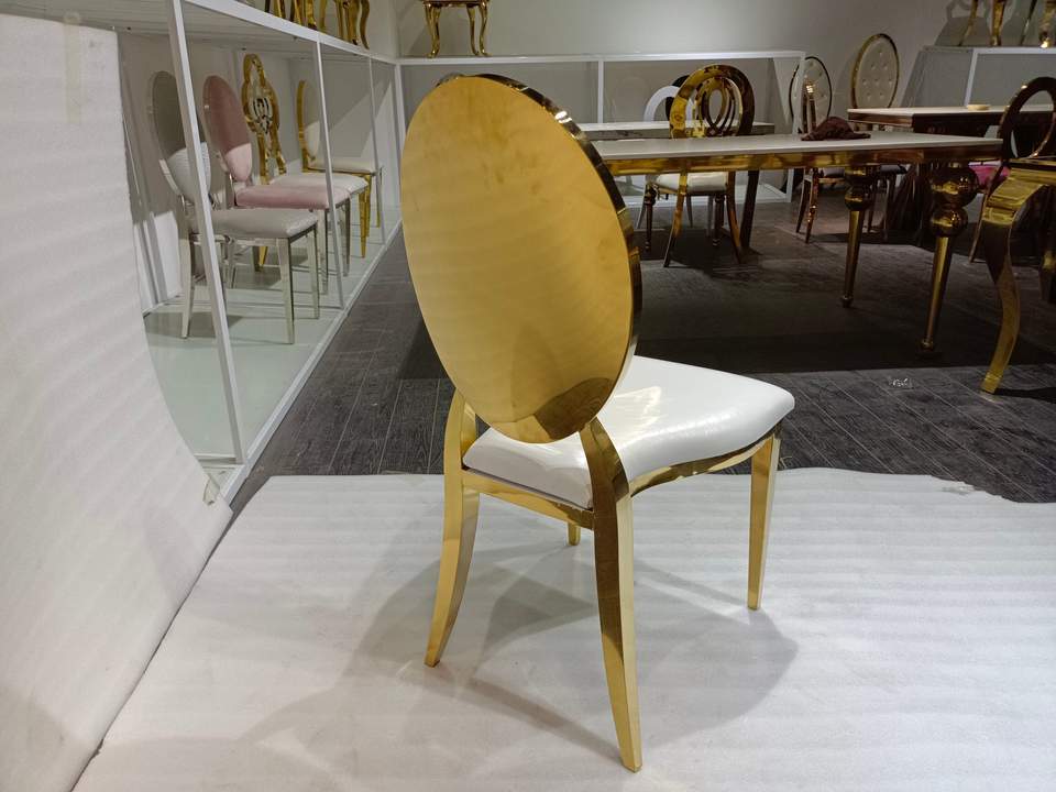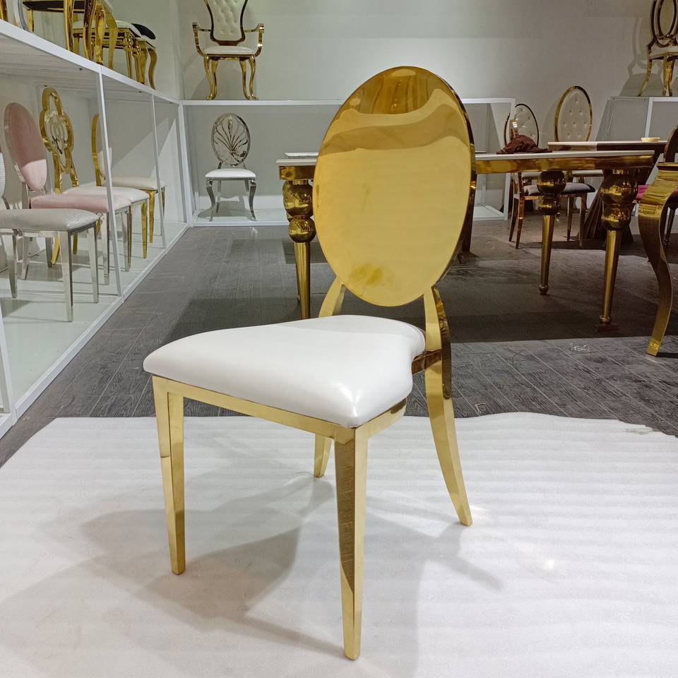 Chaise de salle à manger ovale dorée de luxe - Cadre en acier inoxydable brillant avec siège en similicuir blanc pour hôtel/restaurant