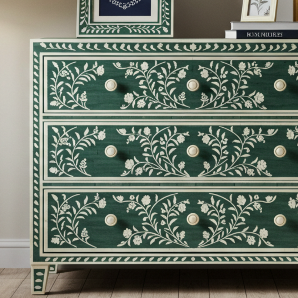 Commode à 6 tiroirs en bois vert luxueux, incrustée de pierres, moderne, faite à la main, écologique, pour la chambre à coucher, le salon, vente en gros/revendre