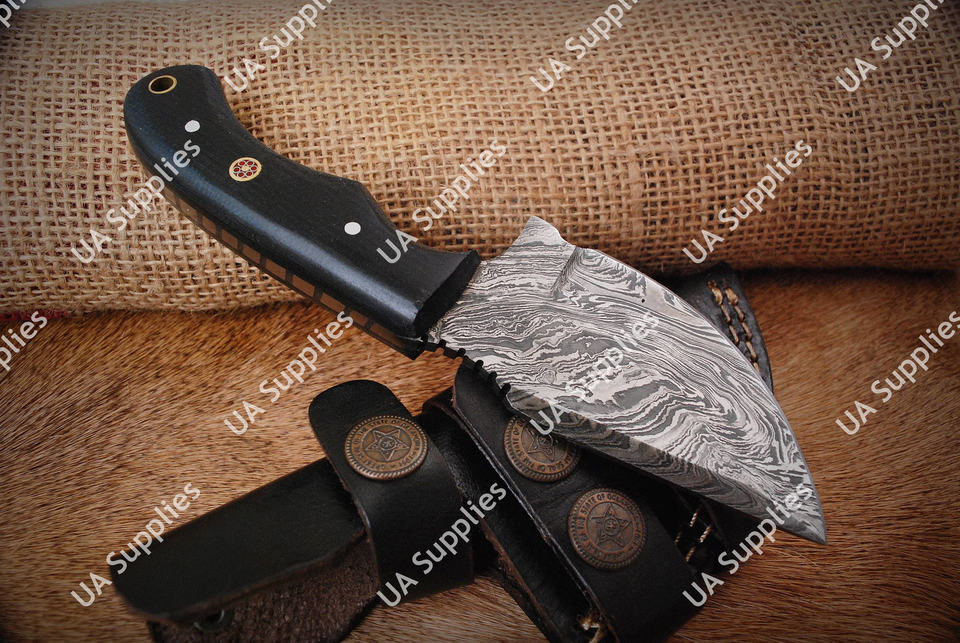 Couteau de chasse de luxe à lame fixe en damas forgé à la main, manche en micarta, 4 pouces, couteau à dépecer, vente en gros personnalisée OEM, chasse, camping, EDC, survie