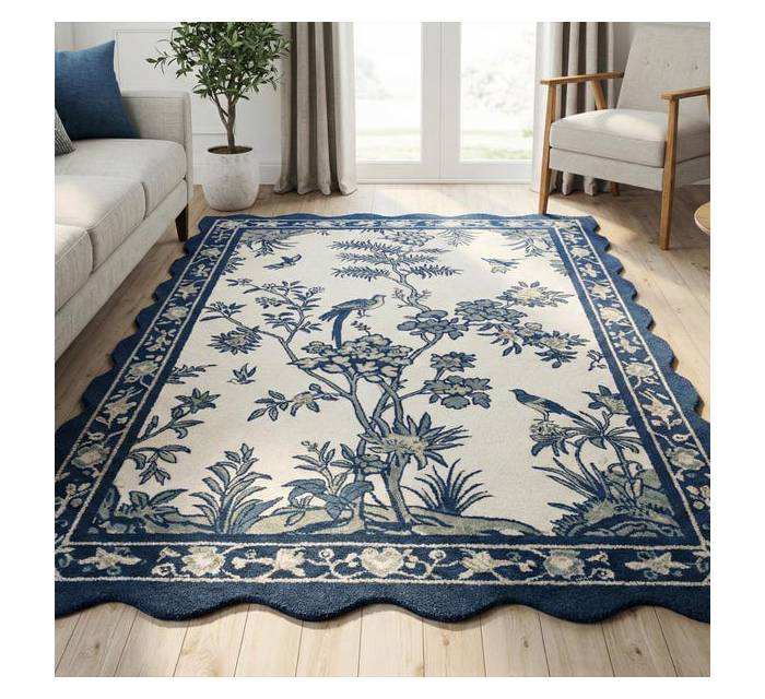 Tapis en laine tufté à la main de luxe, bleu et blanc, motif floral chinoiserie, tapis d'appoint personnalisé, tapis oriental pour salon