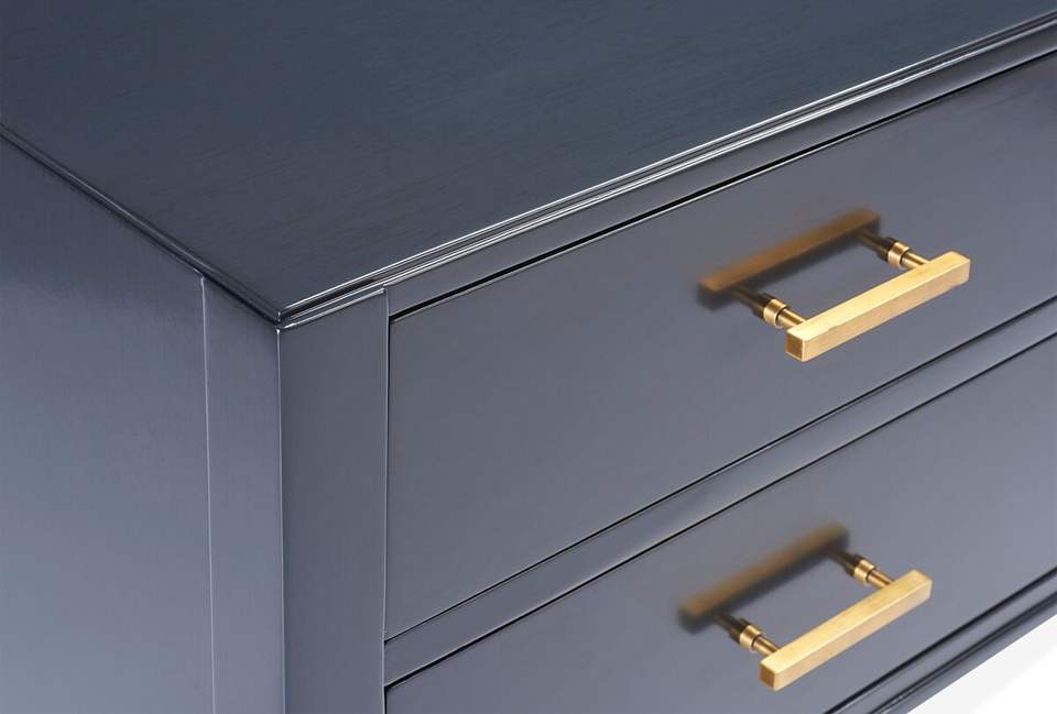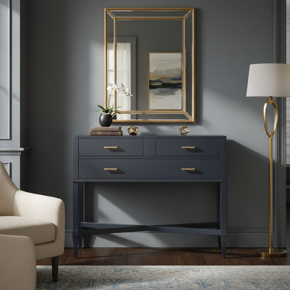 Table console en bois artisanale de luxe à 3 tiroirs, entrée, couloir, coffre avec quincaillerie en laiton pour maison de luxe, hôtel et complexe hôtelier