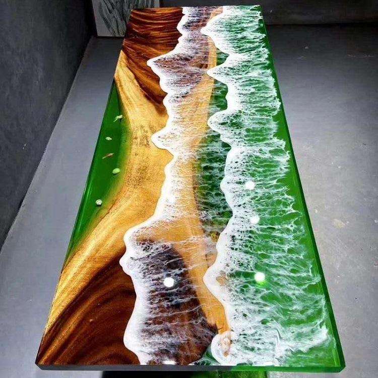 Table à manger rectangulaire moderne en résine époxy artisanale de luxe avec plateau en bois d'acacia aux tons chauds pour le salon