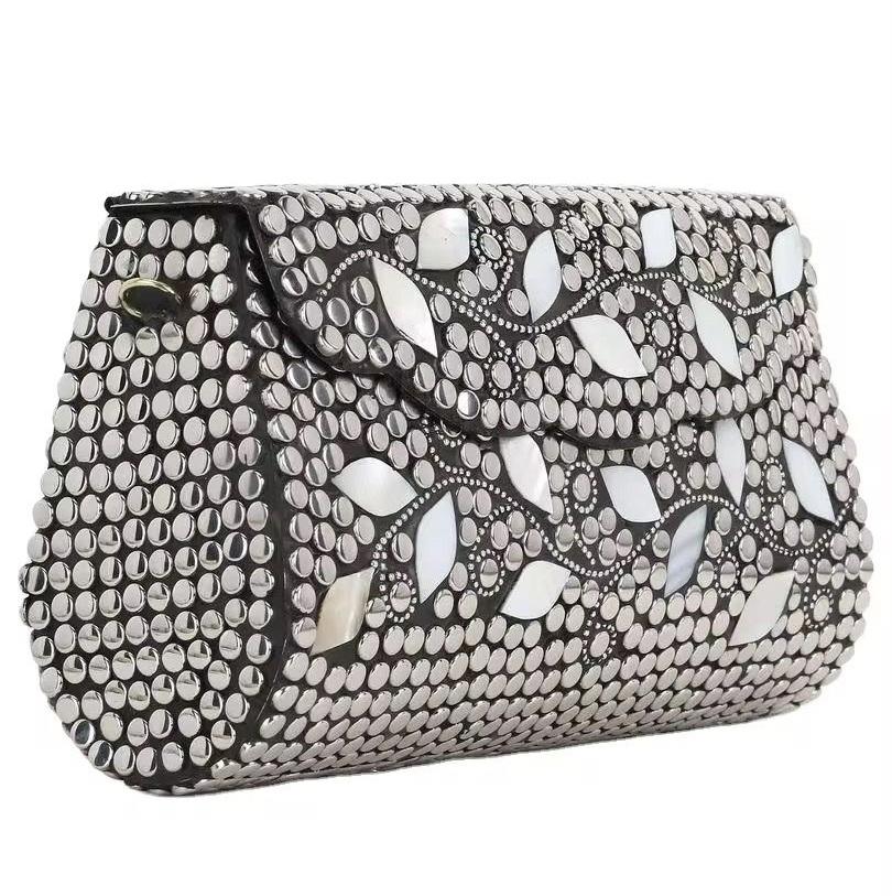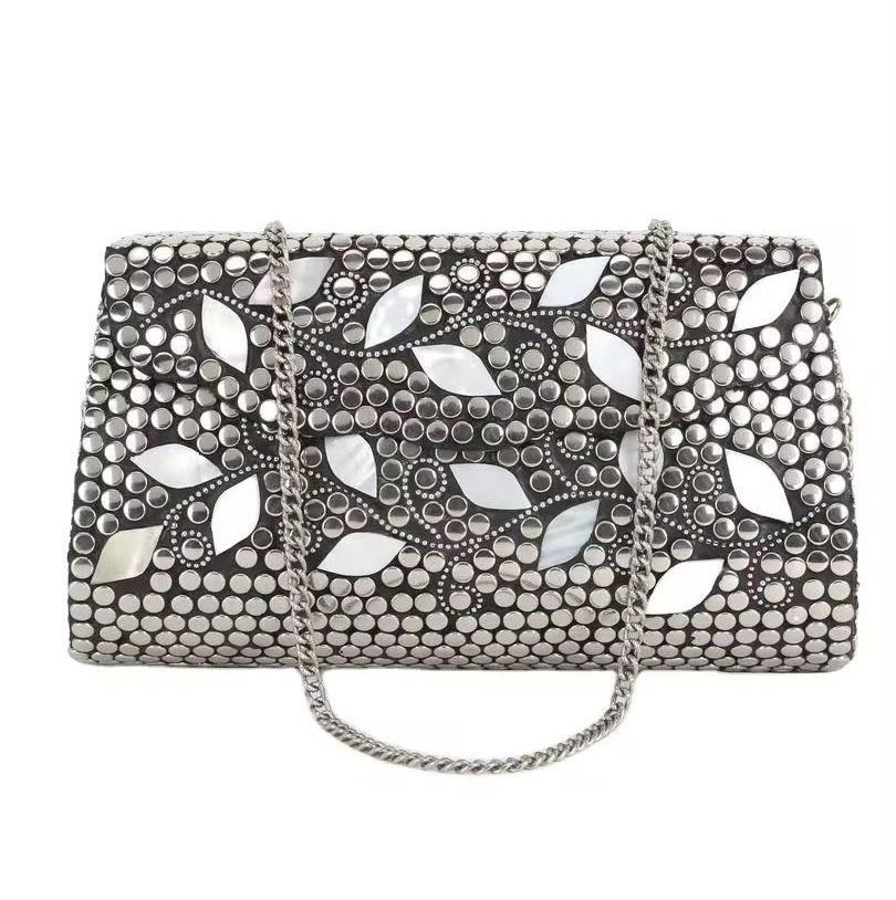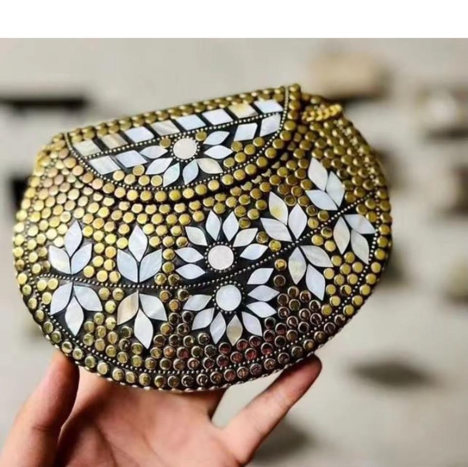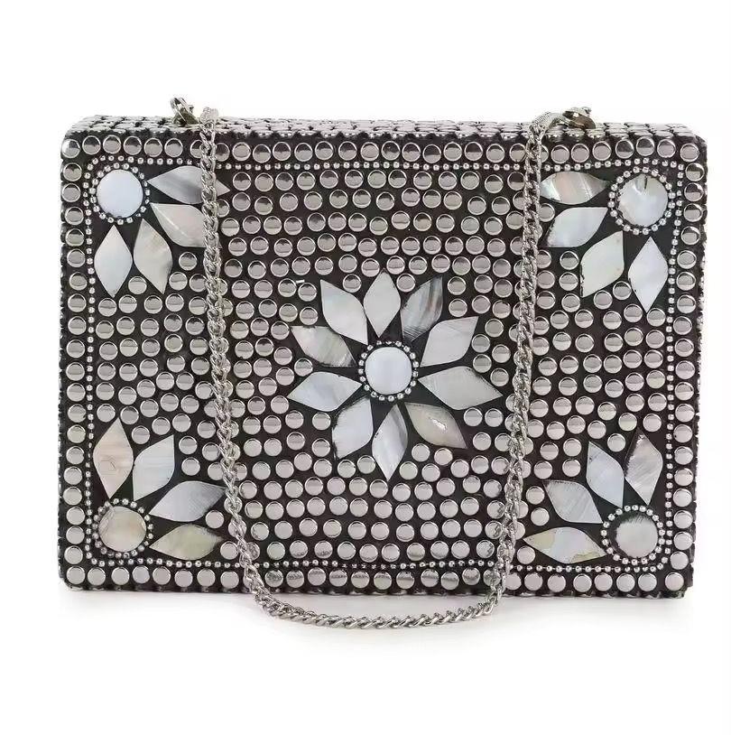 Sac à bandoulière de luxe artisanal en métal incrusté de nacre, motif floral mosaïque, sac de soirée de créateur pour mariage, God Grace Craft Custom