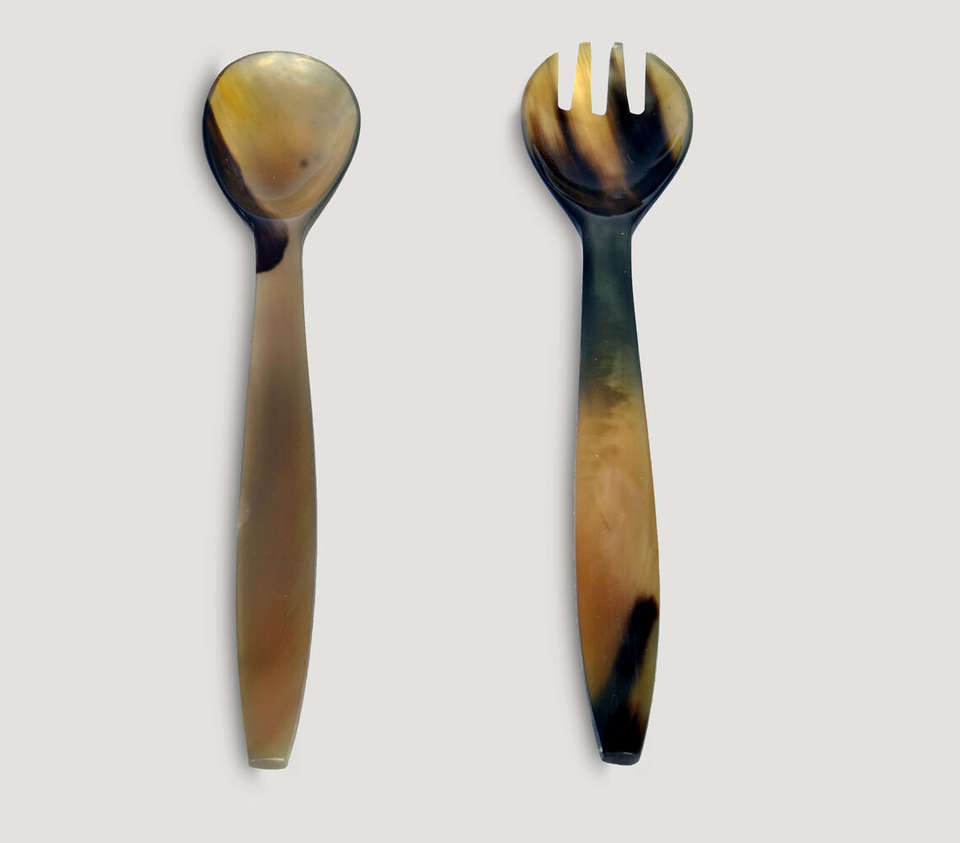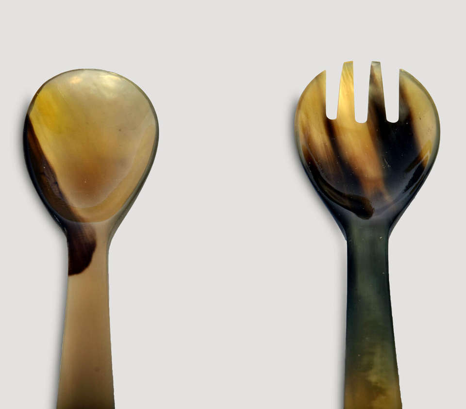 Ensemble de serveurs à salade en corne naturelle artisanale de luxe avec des poignées uniques et élégantes, grande cuillère à mélanger et fourchette de service pour