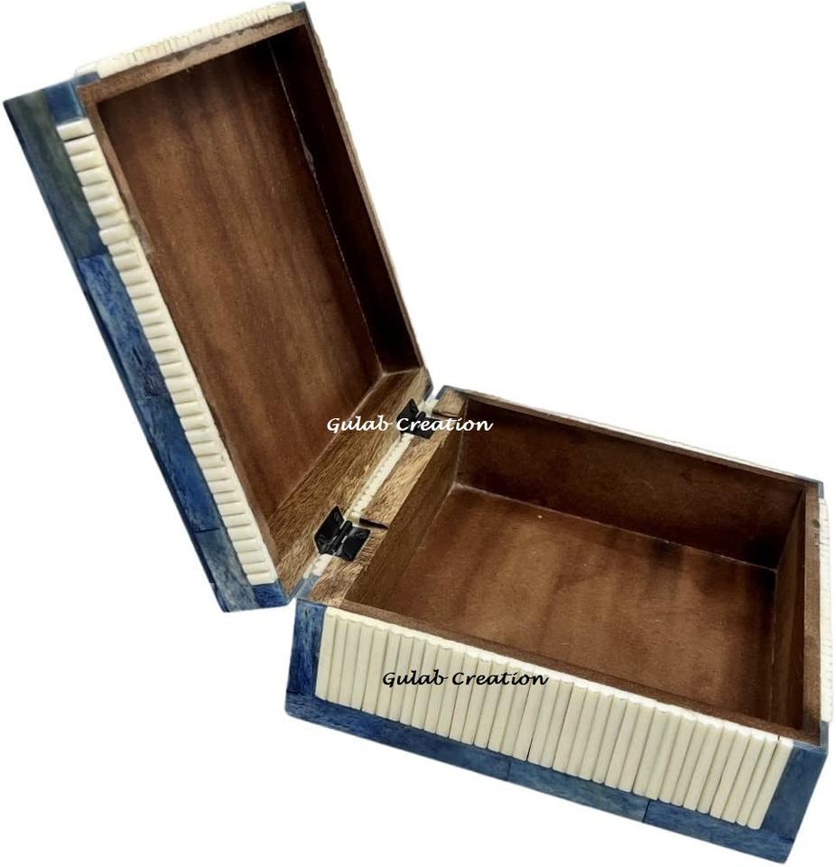 Boîte à bijoux carrée de luxe artisanale à charnières, avec incrustation de os complexe, polie, classique, élégante, vintage, pour table