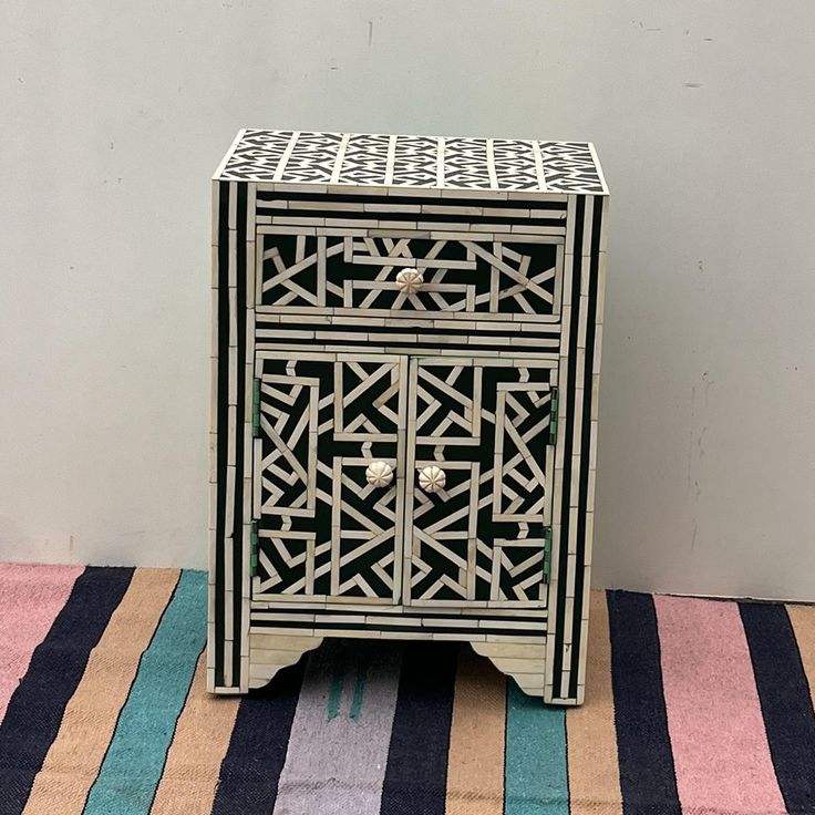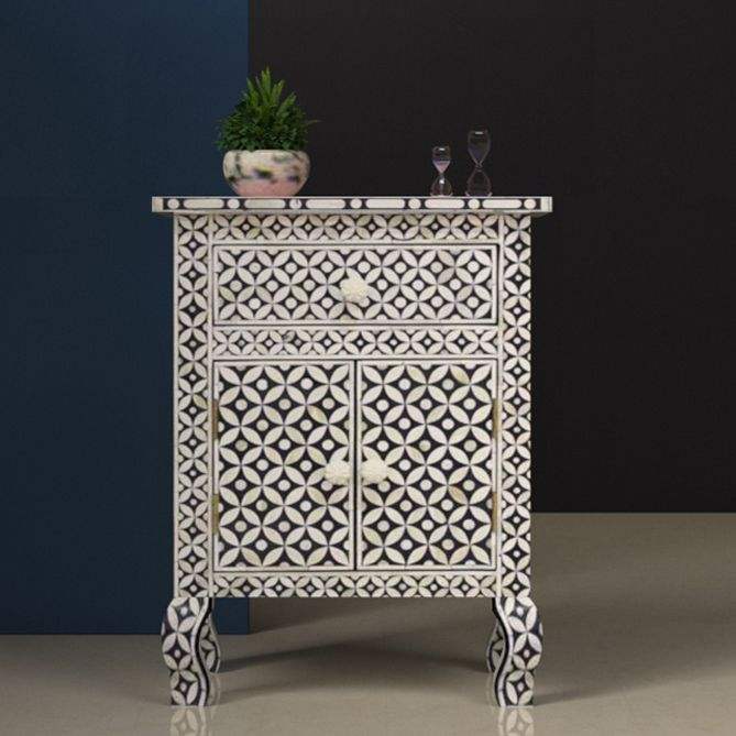 Meuble de rangement latéral en bois décoratif de luxe fait main avec incrustations en os et motifs floraux