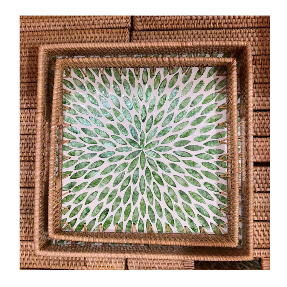 Plateau de service en rotin fait main de luxe avec incrustation de nacre, plateau décoratif pour la décoration intérieure