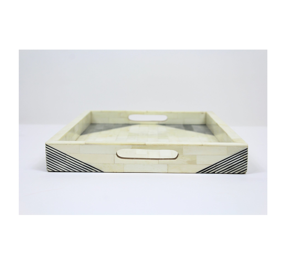 Luxury Handmade Round Bone Inlay Serving Tray with Handles Decorative Accent Tray for Coffee Table and Kitchen