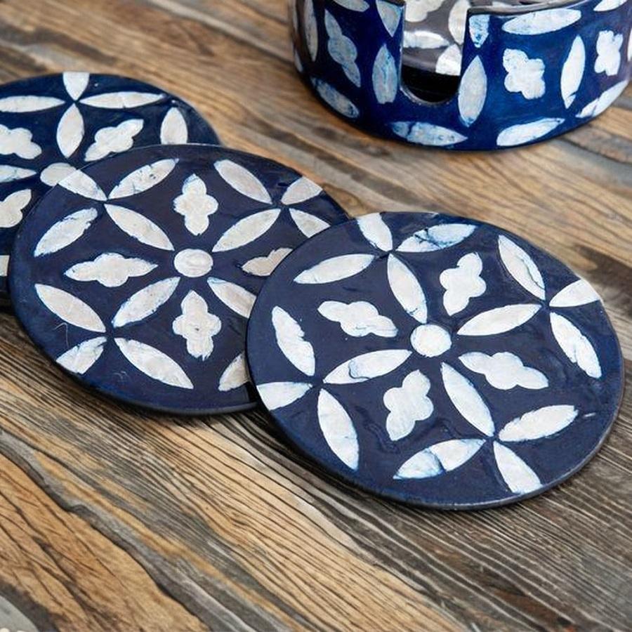 Ensemble de sets de table légers en bois fait main de luxe avec incrustations d'os et de nacre, sous-verres classiques écologiques bleu ciel et blanc, personnalisables haut de gamme