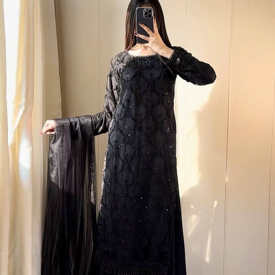 Kurta en tulle brodé de luxe avec palazzo et dupatta en crêpe français – Ensemble ethnique prêt-à-porter pour femme, idéal pour les fêtes