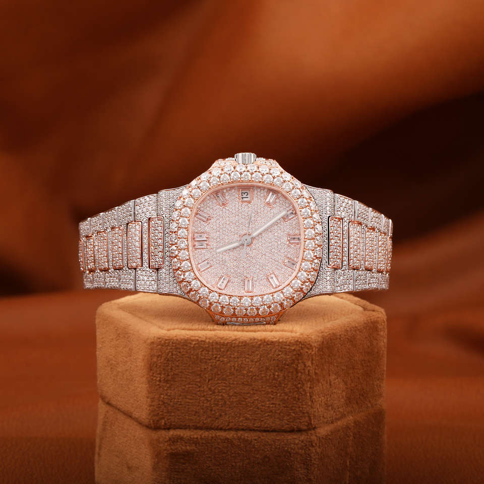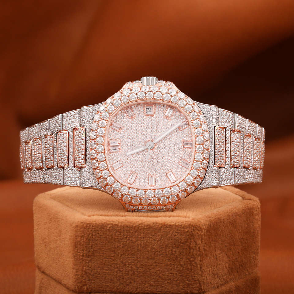 Luxury High Quality Iced Diamond Glass Watch Men Full Pave Hip Hop Bling Rose Gold Stainless Steel Auto Movement Rapper Style