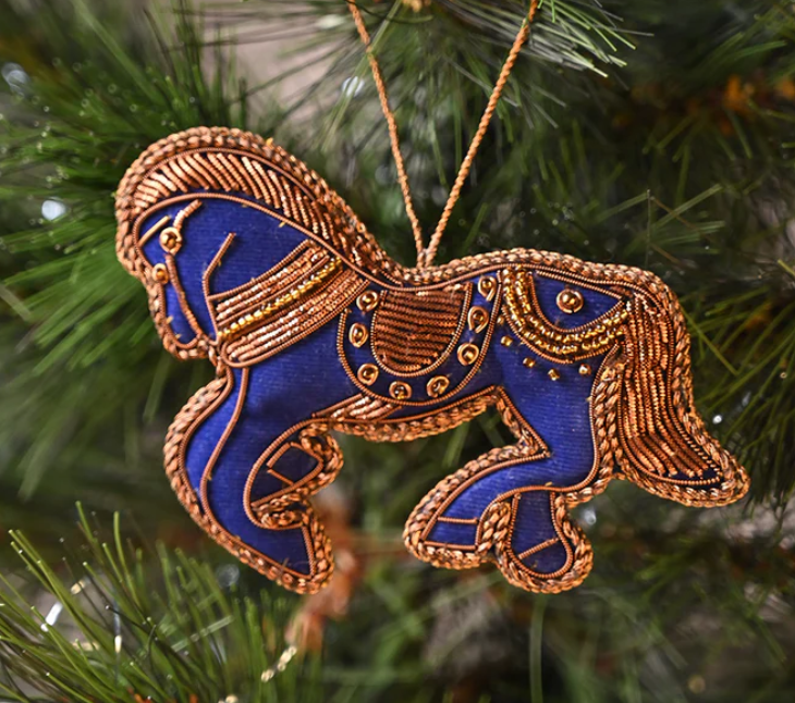 Ornement mural de Noël en forme de cheval brodé de zari doré multicolore de luxe, fait main, indien, festif, personnalisable