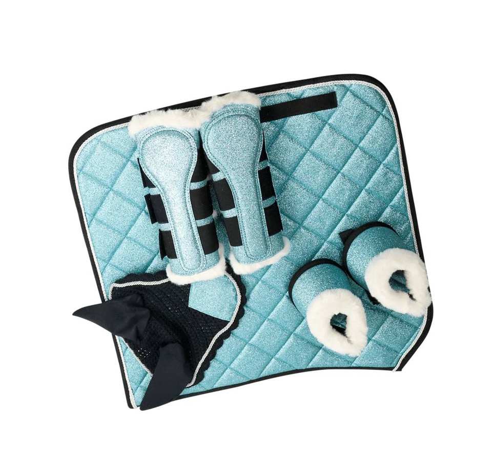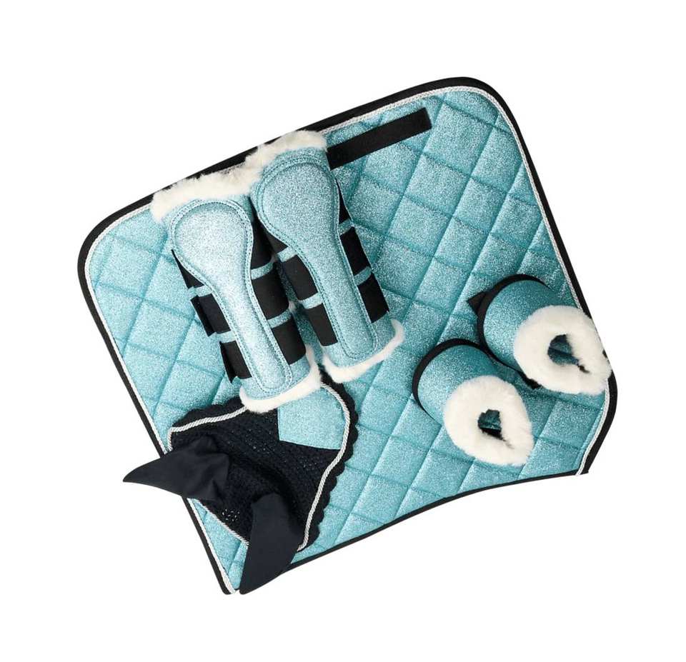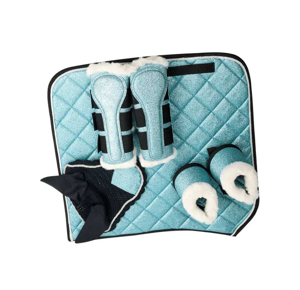 TARIQ MFG CO Ensemble d'équitation de luxe avec coussin de selle matelassé, bottes scintillantes et couvre-oreilles