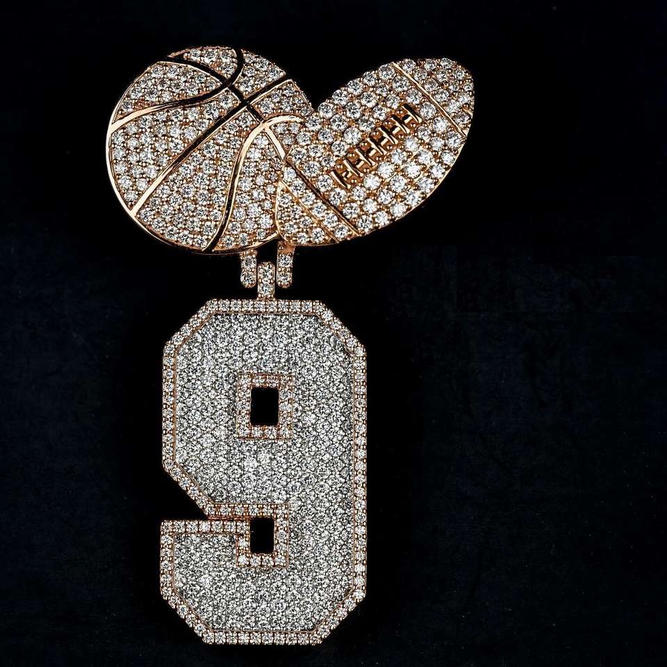 Pendentif de luxe en moissanite numéro 9, style hip-hop, sport, déclaration, en argent sterling plaqué or rose et blanc