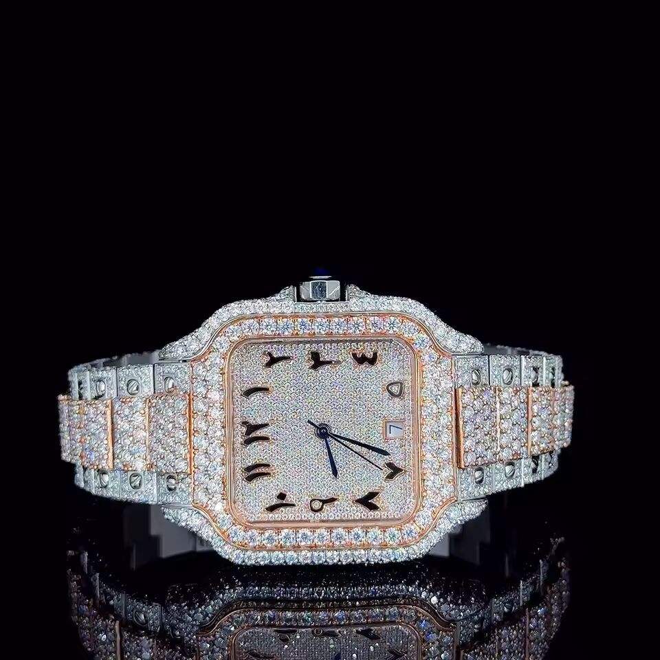 Montre de luxe à quartz pour homme, cadran rond bicolore, entièrement pavée de diamants CZ, style Hip Hop, bracelet en acier inoxydable à chiffres romains