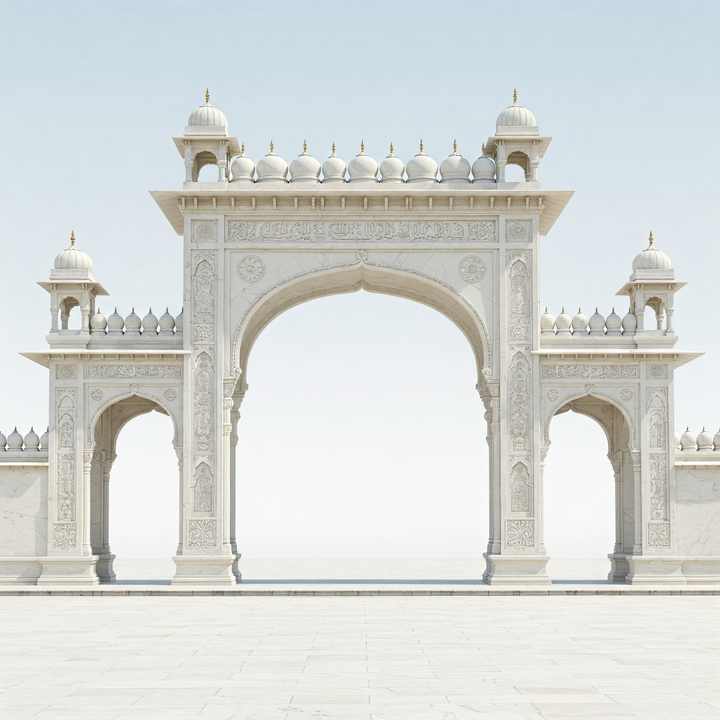 Porte d'entrée rétractable islamique en marbre blanc importé de luxe, pavillon à dôme, arche, sculpture en pierre en relief profond, hôtel, industriel