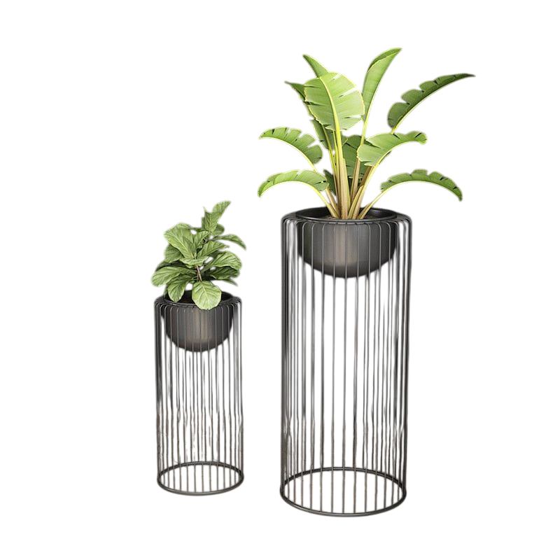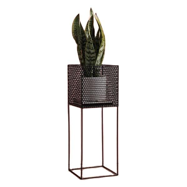 Jardinière de luxe en finition cuivre avec support vertical en métal noir, idéale pour les hôtels, les villas, les bureaux et les espaces de vie modernes