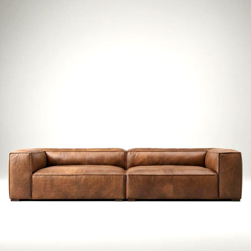 Canapé modulaire en cuir de luxe de conception italienne, en cuir pleine fleur véritable, sectionnel avec profil bas et coussins surdimensionnés