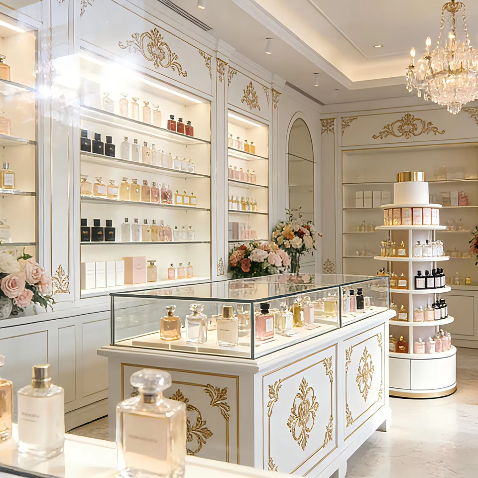 Vitrine murale de luxe en verre trempé et métal avec éclairage LED pour présentation de parfums en magasin et en musée
