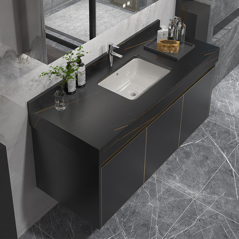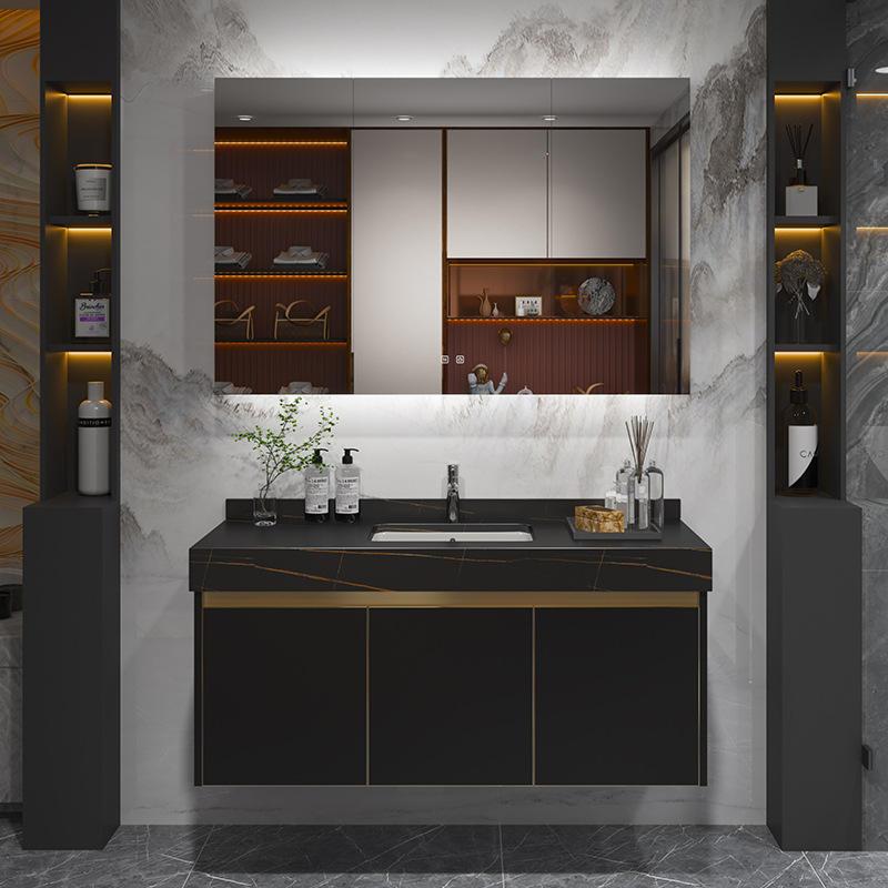 Meuble de salle de bain mural en céramique laquée de luxe avec miroir LED et finition chromée pour hôtel