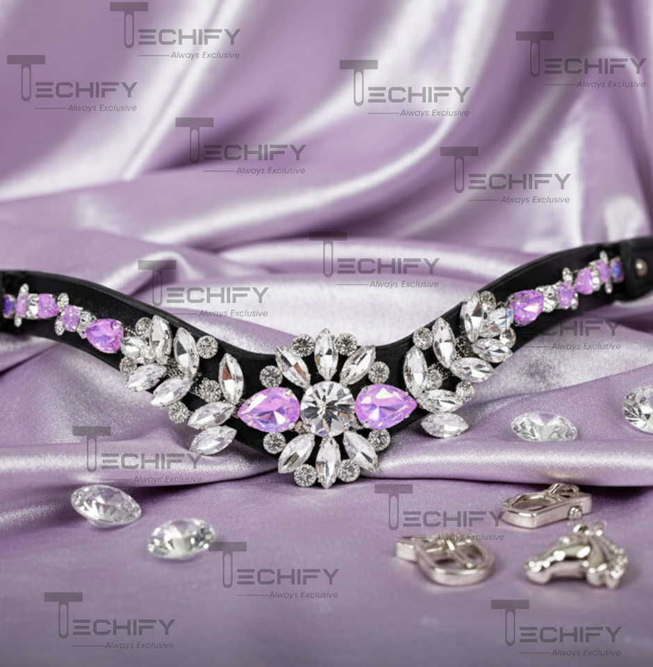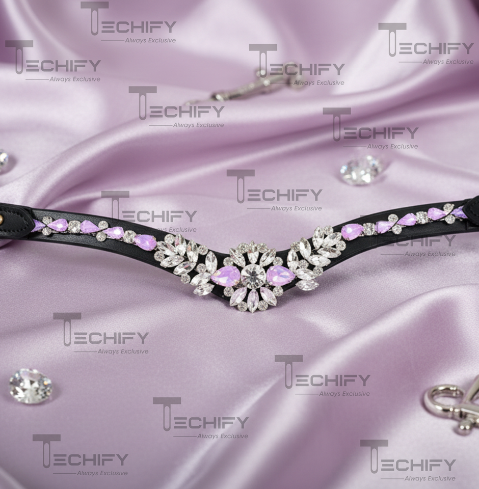 Luxury Lavender & Clear Crystal Horse Brow band Floral V Shape Design Handmade Black Leather Equestrian Bridle Accessory