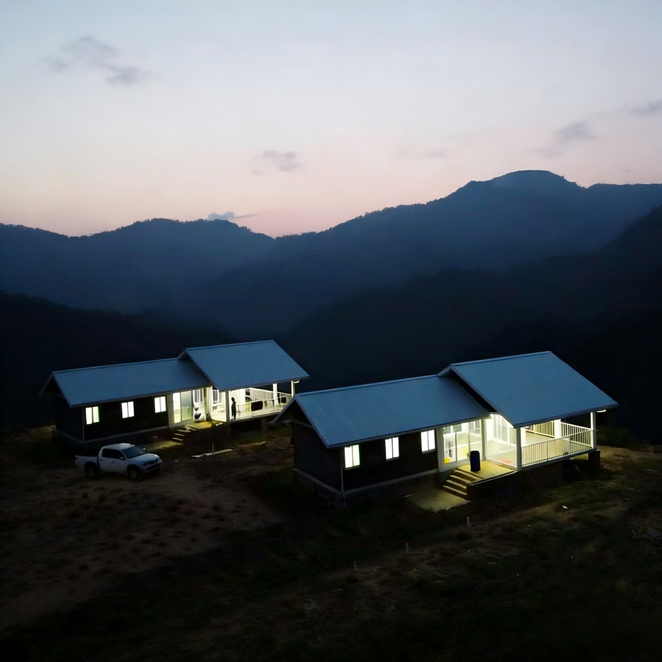 Villa de luxe en acier léger, toit en pente, maison préfabriquée pour complexe hôtelier avec balcon et terrasse, cabane modulaire à ossature acier, conception personnalisée