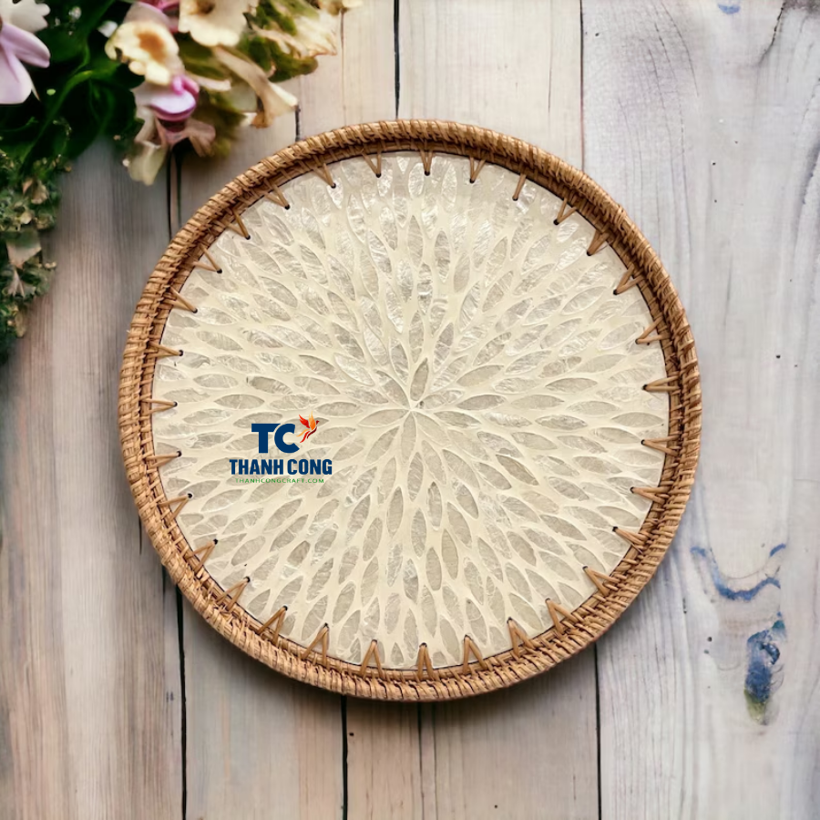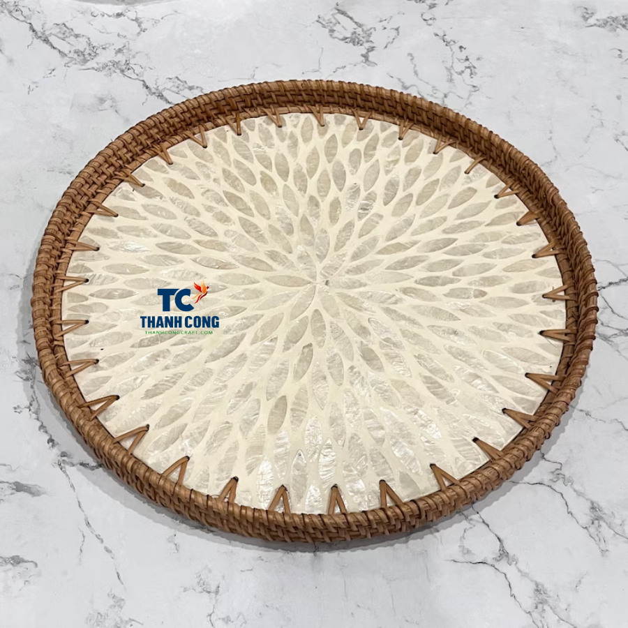 Plateau de luxe en nacre avec bord en rotin tissé Plateau de service décoratif en bois pour restaurants et hôtels