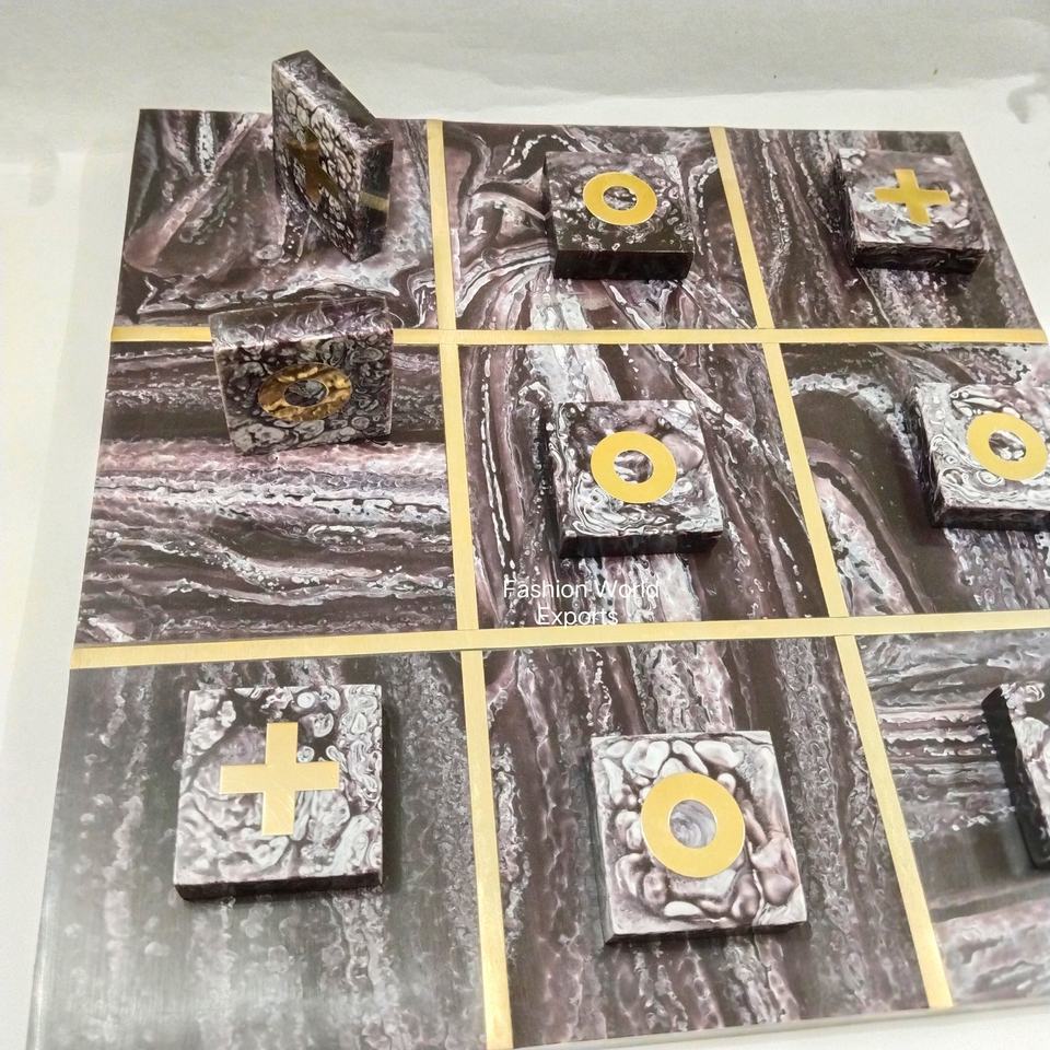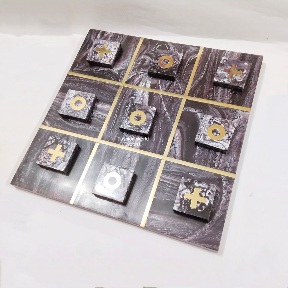 Plateau de jeu de Tic Tac Toe de luxe en marbre avec grille incrustée d'or et pièces décoratives X O, jeu de société moderne pour la décoration intérieure