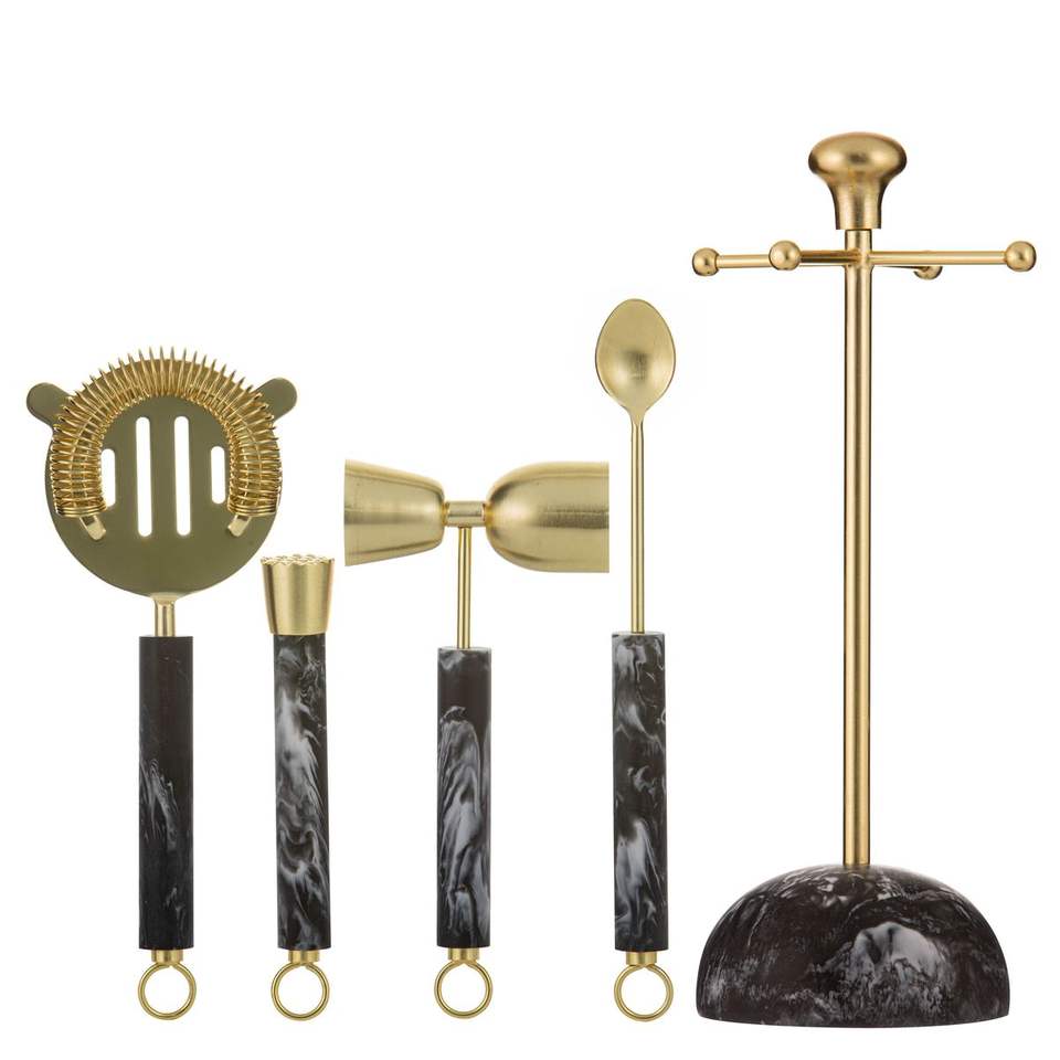 Ensemble d'outils de bar en or mat de luxe avec poignées en marbre noir, kit de fabrication de cocktails haut de gamme, équipement de mixologie moderne, support décoratif
