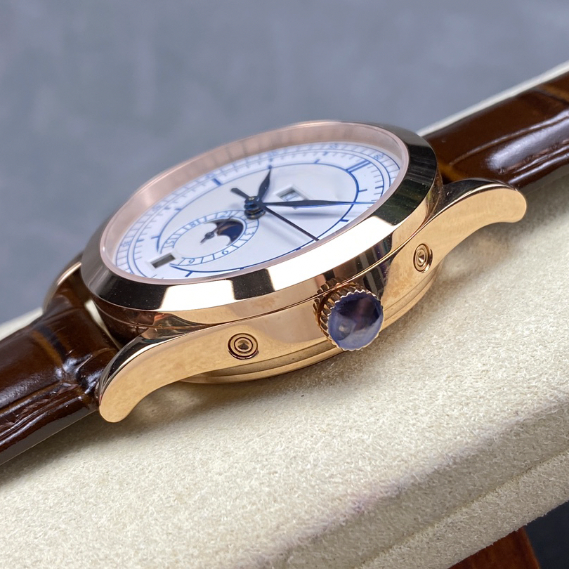 Montre automatique de luxe pour homme, boîtier en or rose, cadran argenté, aiguilles bleues, calendrier annuel, phase de lune, bracelet en cuir