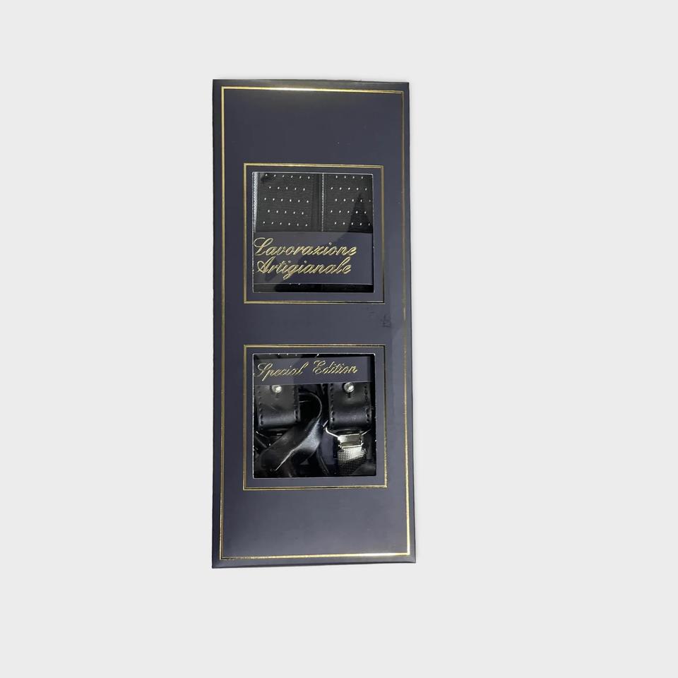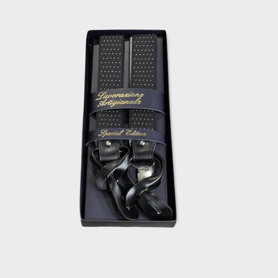 Men's Black Elastic Suspenders with Dotted Pattern PU Leather End Braces Adjustable Metal Clip Special Edition Gift Box
