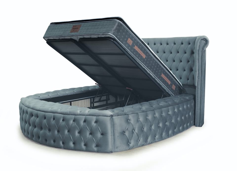 Lit de rangement circulaire rembourré en velours gris doux au design moderne de luxe avec cadre en bois massif California King Size