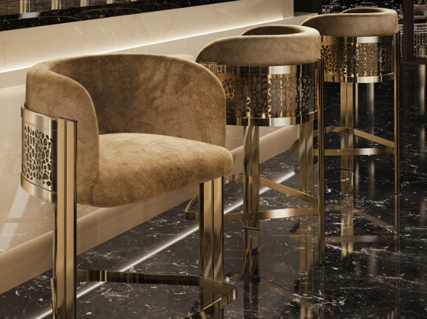 Tabouret de bar haut en velours, acier inoxydable doré moderne et luxueux pour la maison, le restaurant, l'hôtel, le pub, le mariage