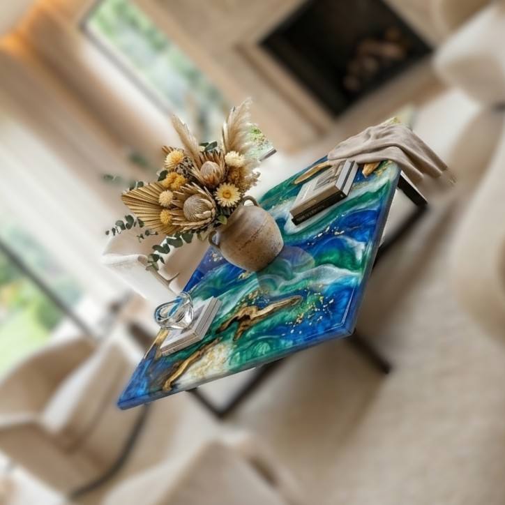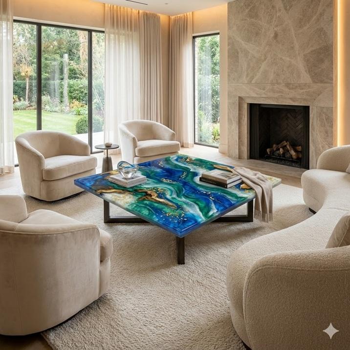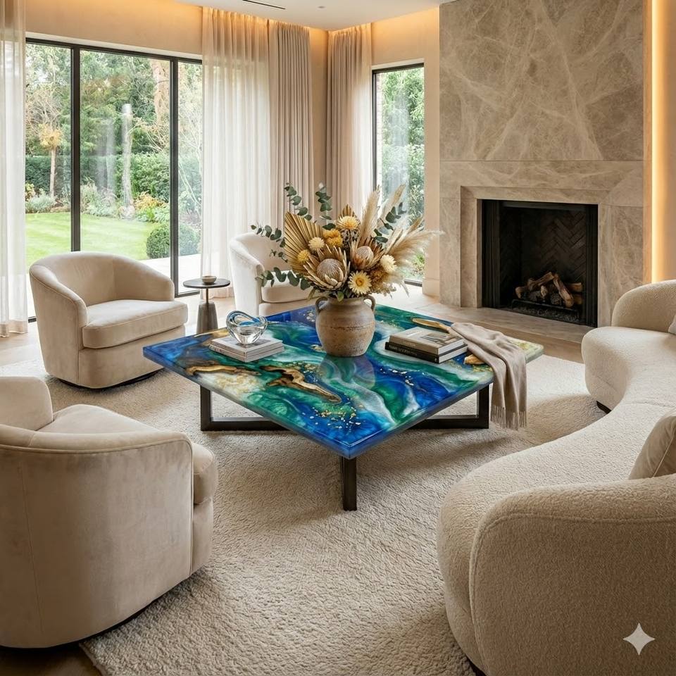 Table carrée en résine de style moderne et luxueux pour la décoration de la maison et la salle à manger, plateau en bois d'acacia massif, design élégant de rivière, vaisselle polyvalente