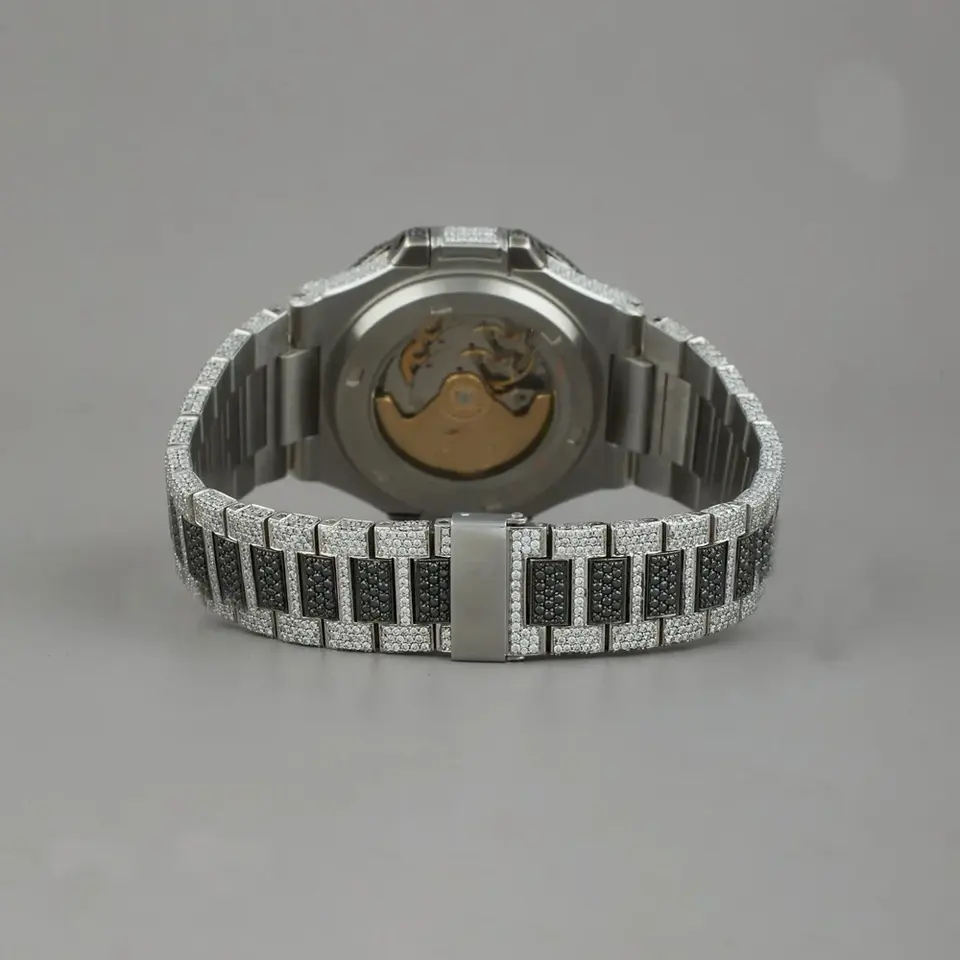Montre de luxe pour homme en acier inoxydable, cadran pavé complet de diamants et de moissanite blancs et noirs, mouvement à quartz
