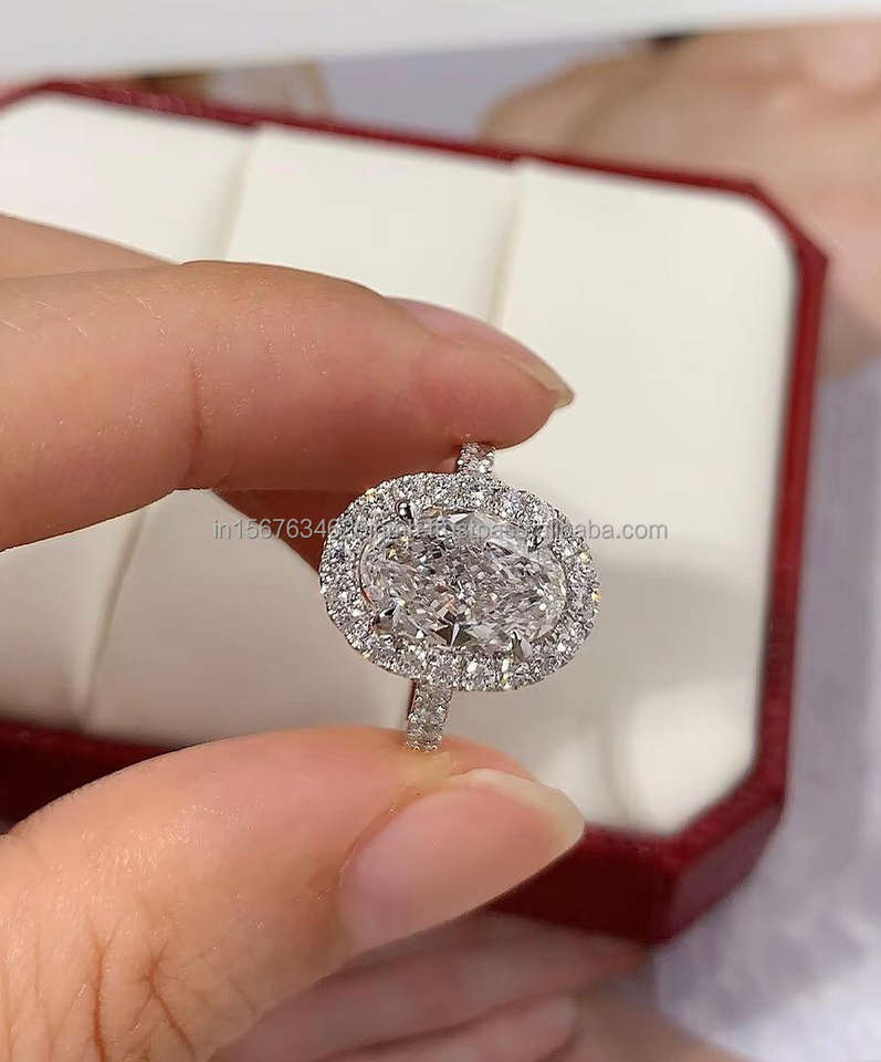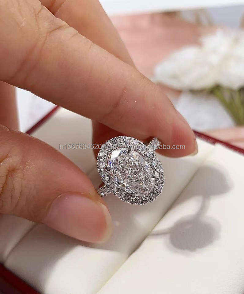 Bague de fiançailles de luxe en or blanc avec diamant ovale de laboratoire et halo de diamants, bague de mariage ovale en or blanc avec diamants ronds sur les côtés pour femme