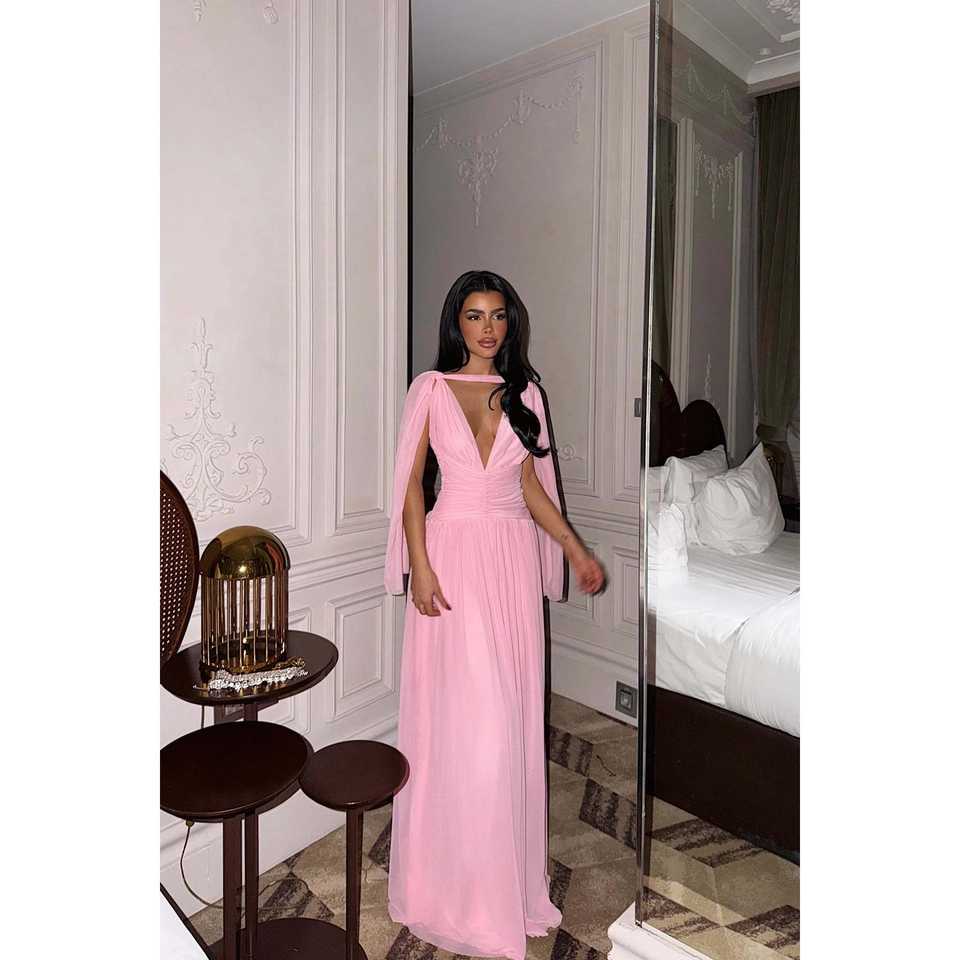 Robe de soirée de luxe rose coupe trapèze longue avec détails froncés, taille empire, ornée de sequins, de perles, de fleurs et de plumes, idéale pour une soirée romantique