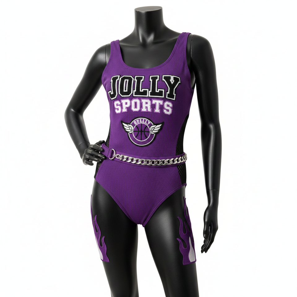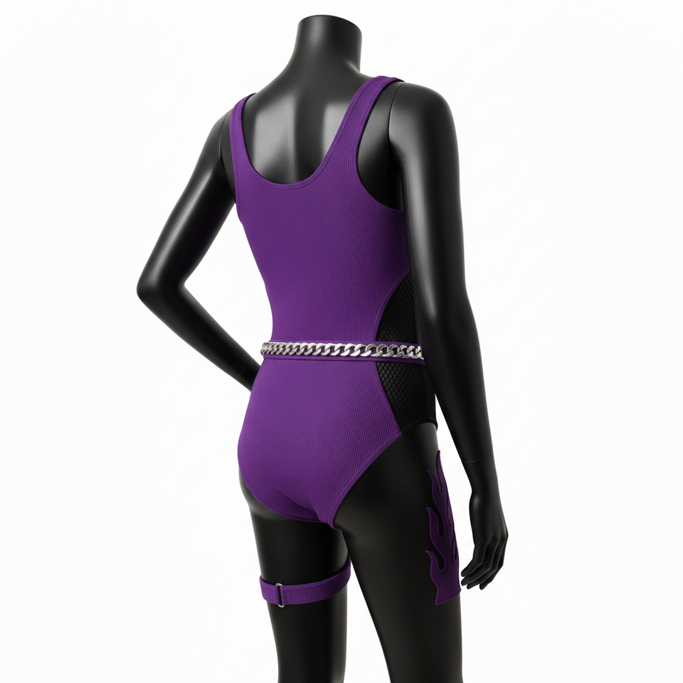 Ensemble de bain luxueux en polyester et élasthanne, tissu extensible doux, violet avec empiècements en mesh, logo personnalisé, pour femme.