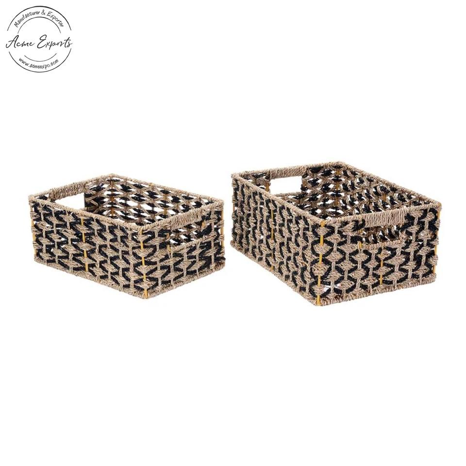 Panier en jonc de mer fait main avec accents en métal noir idéal pour le rangement du comptoir de la salle de bain Organisateur élégant et durable