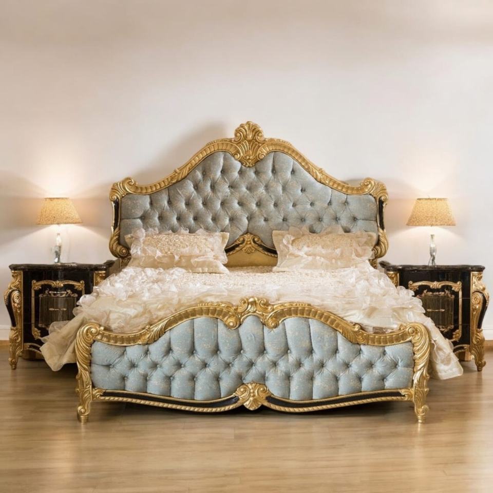Luxury Queen-Size Midcentury Modern Mahogany Bed Frame Hand Carved Eco-Friendly Durable Gold Leaf Finish Blue Tufted Upholstery