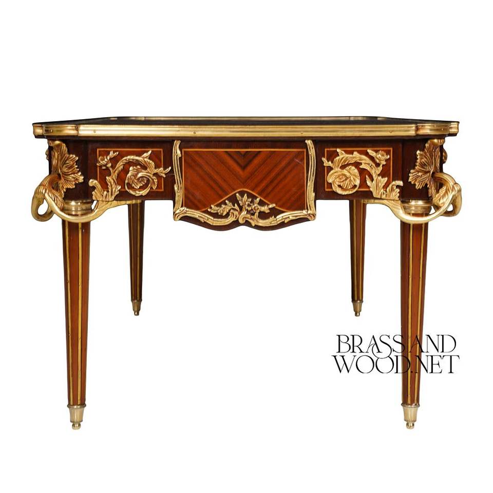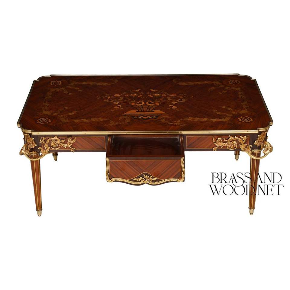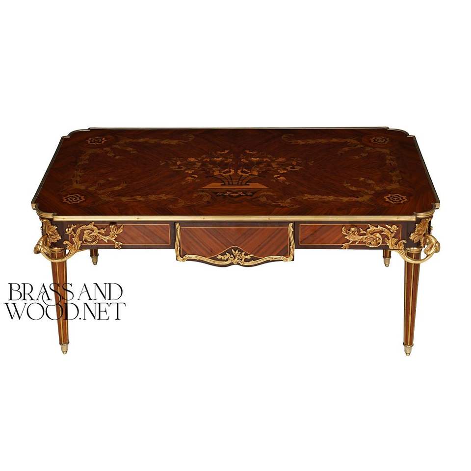Table basse rectangulaire de luxe avec marqueterie florale artisanale et accents en laiton doré orné pour salons classiques