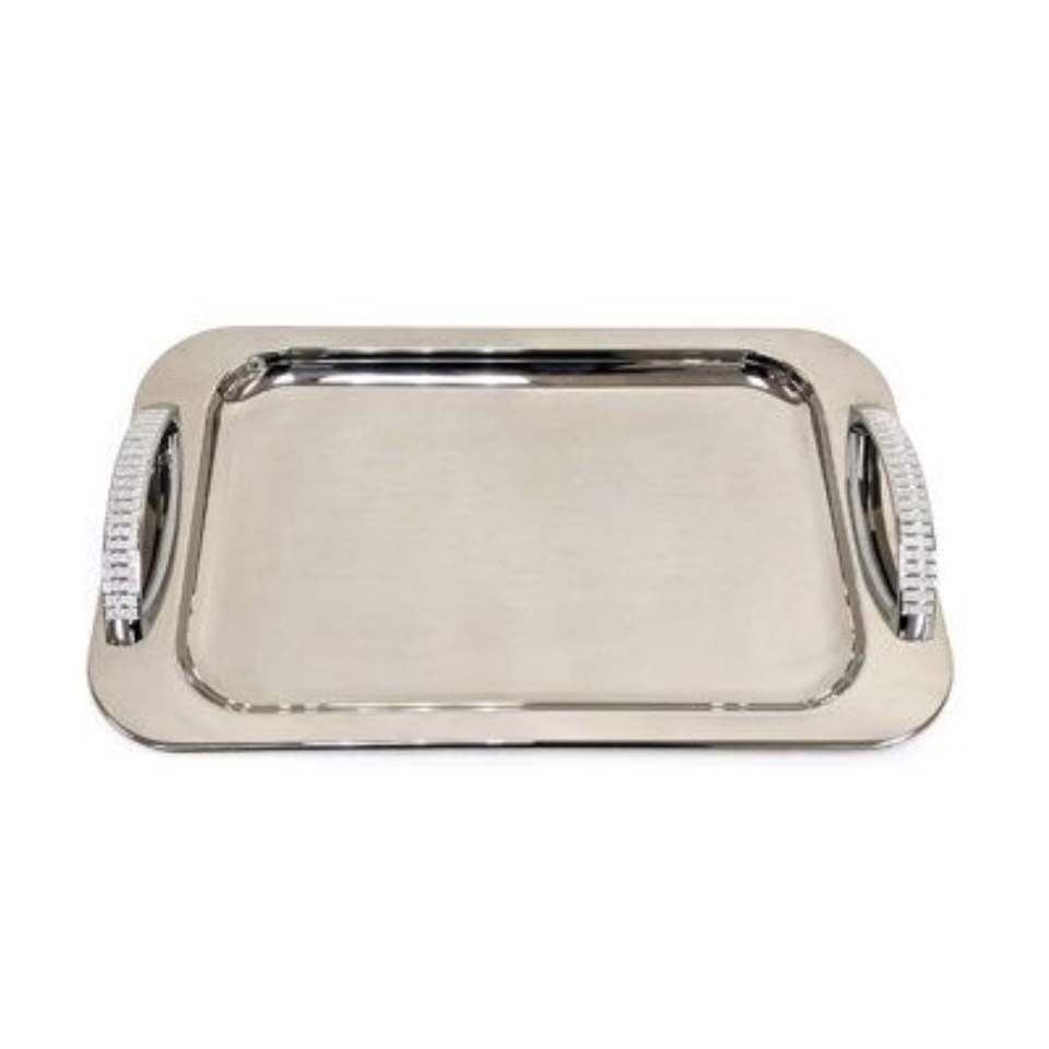 Plateau de service rectangulaire de luxe en métal avec poignées en cristal, plaqué argent, pour mariages, hôtels et décoration en gros