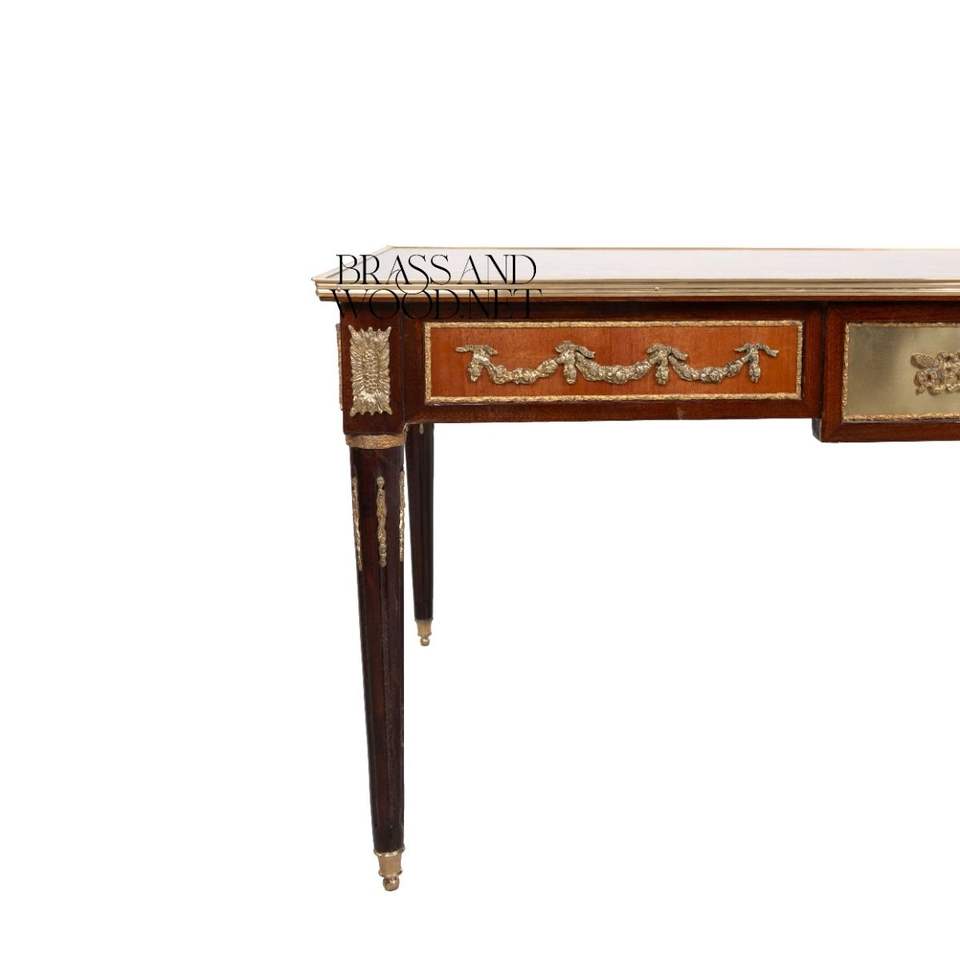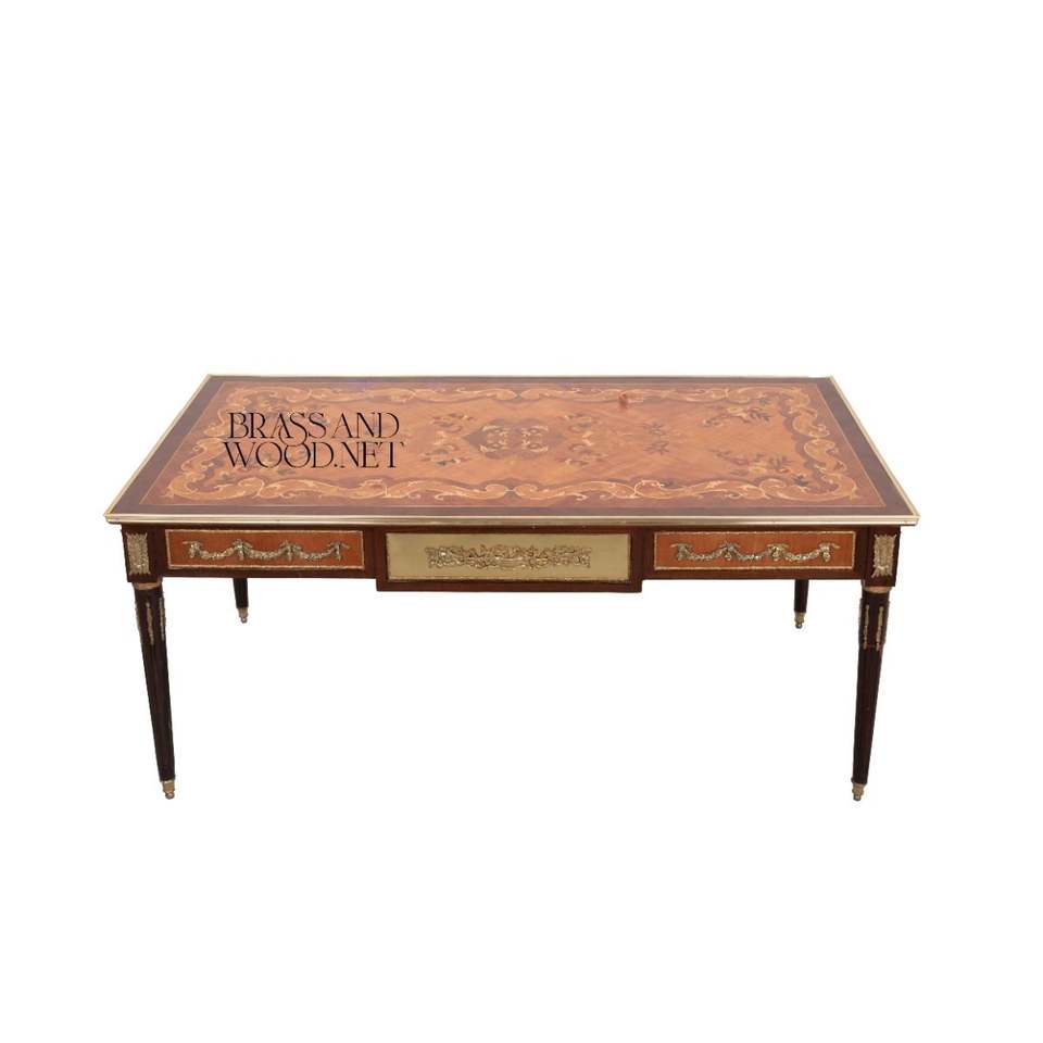 Table basse rectangulaire de luxe en bois incrusté avec ornements en laiton antique et marqueterie florale pour salons classiques
