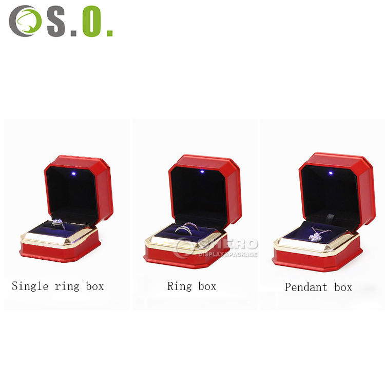 Ensemble de boîtes à lumière LED en plastique premium rouge personnalisées de luxe pour collier, bracelet, bague, boucles d'oreilles avec bordure dorée