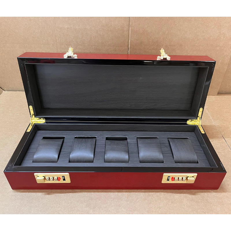 Boîte à montres rectangulaire de luxe en cuir rouge multifonctionnelle et écologique avec compartiment de rangement personnalisable et serrure à clé dorée à accès extérieur