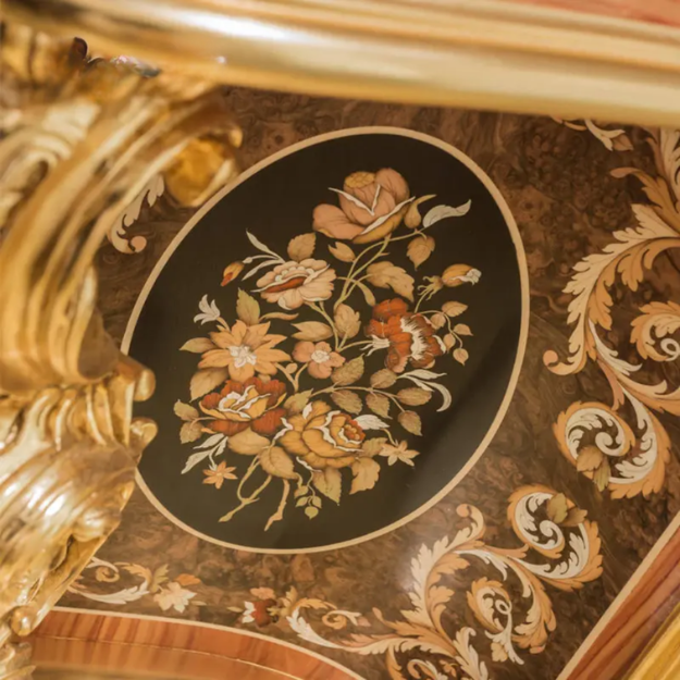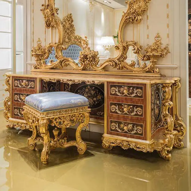 Table de toilette classique de style rococo de luxe en acajou, 6 tiroirs, sculptée à la main, dorée, haut de gamme, avec miroir, pour chambre principale