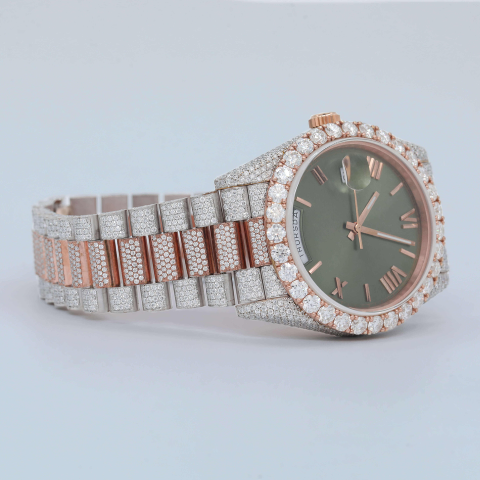 Montre de sport de luxe en or rose deux tons avec diamant, chiffre arabe, caractéristique de la date automatique, bande en acier inoxydable, largeur de bande de 20mm, antiquité